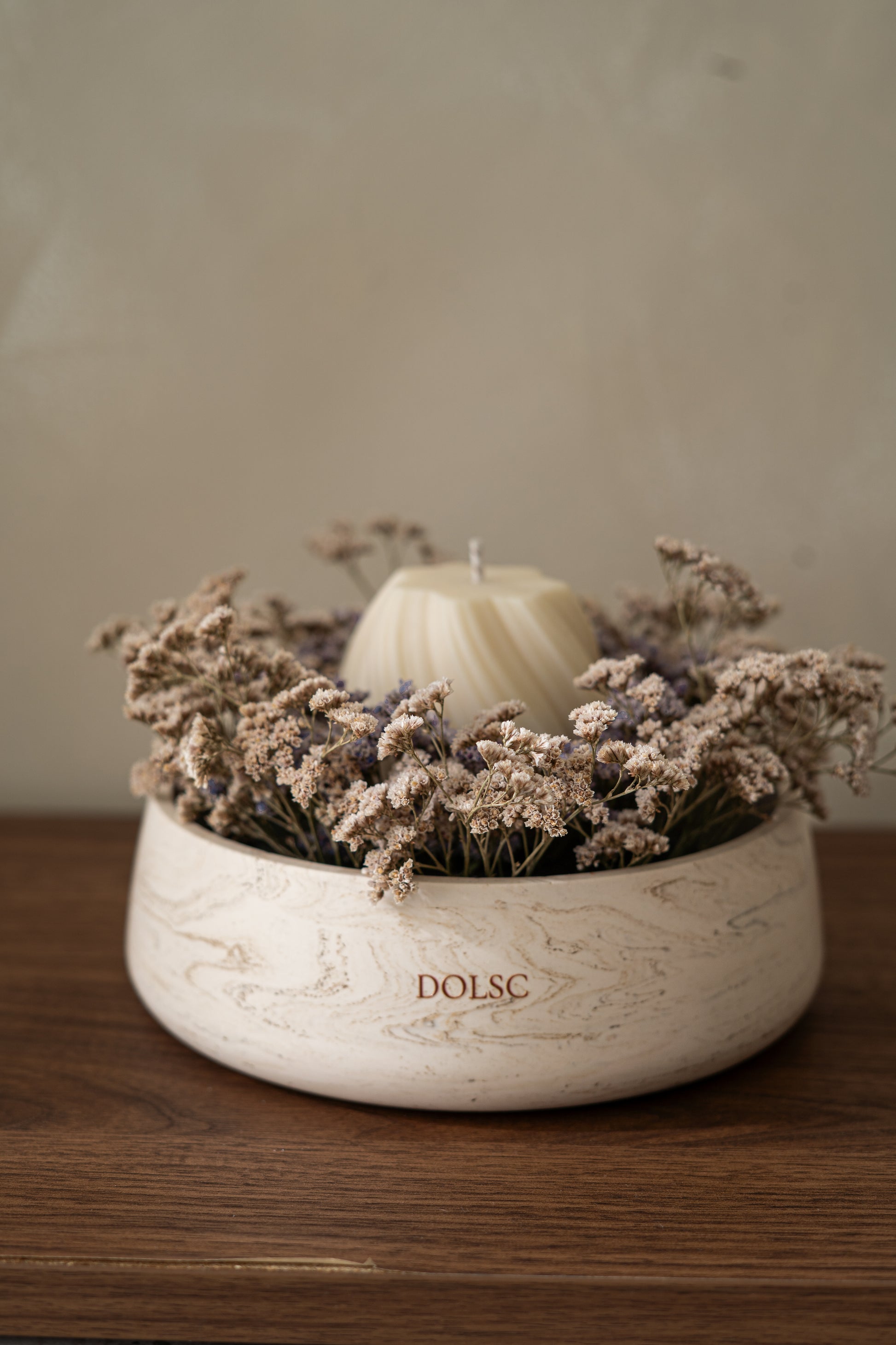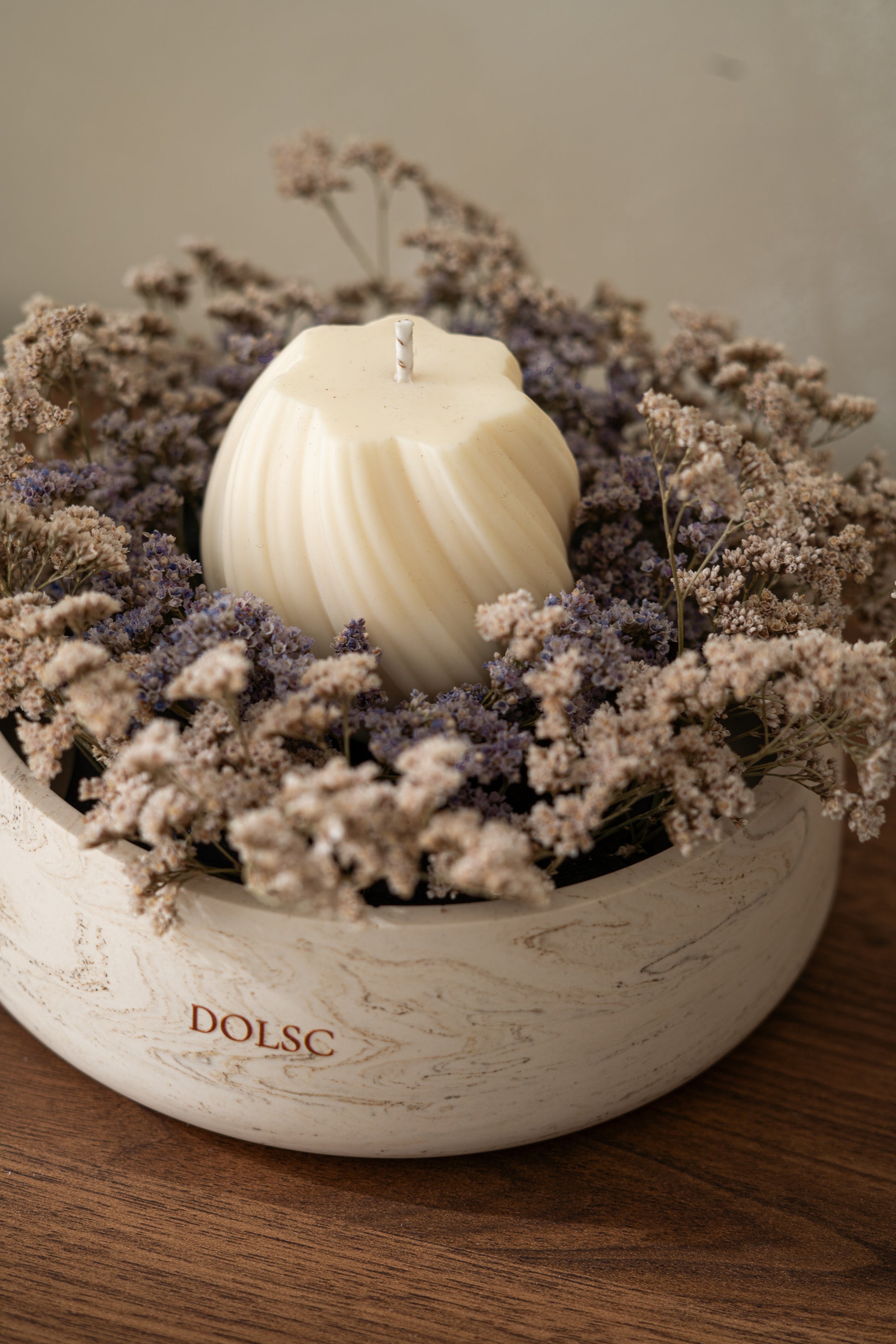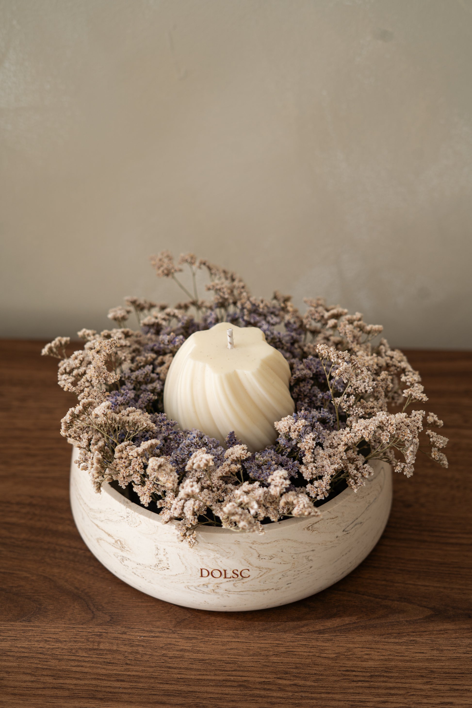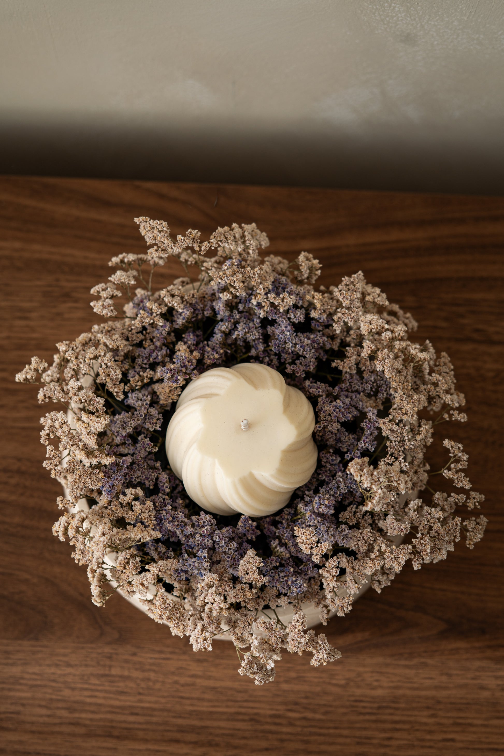 Uma vela perfumada repousa no centro de um delicado arranjo de flores secas, criando um ambiente acolhedor e elegante.