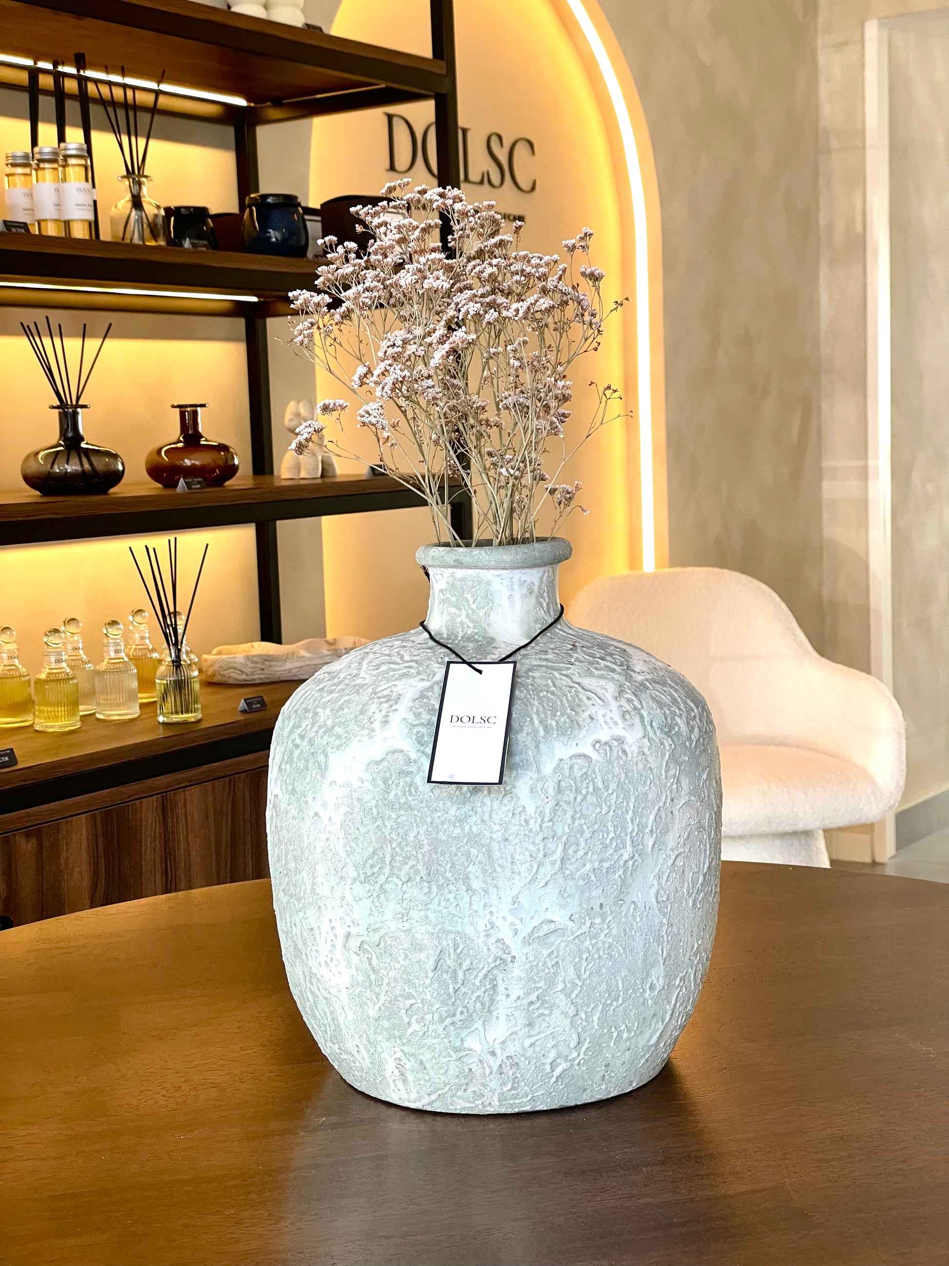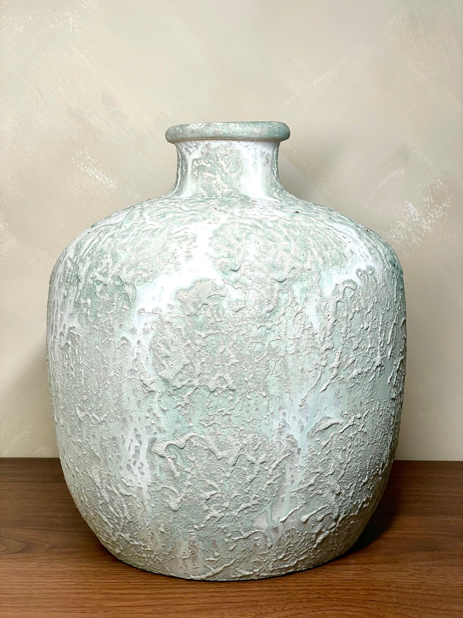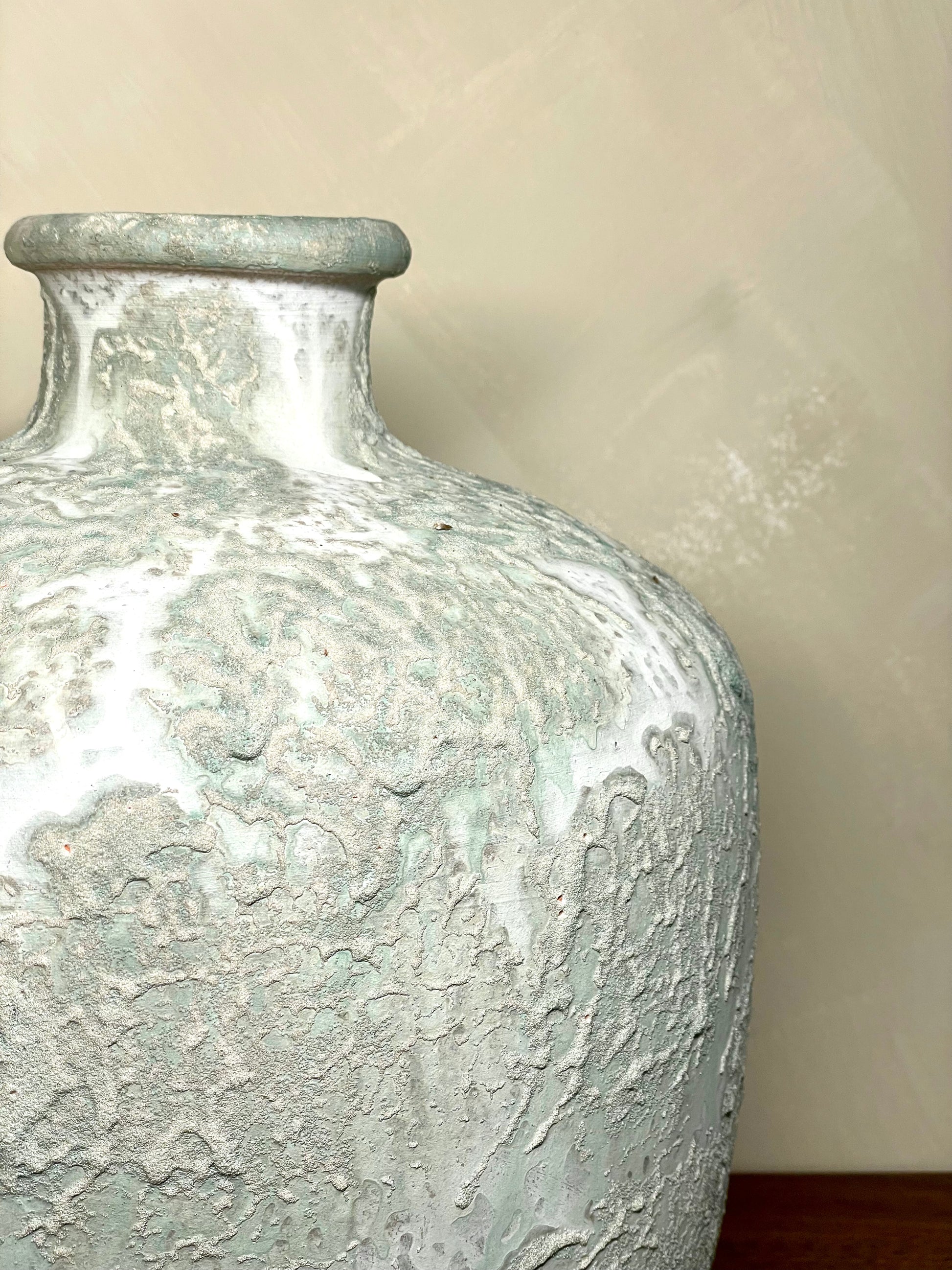 Jarra decorativa em cerâmica artesanal, de forma arredondada com gargalo estreito. Apresenta um acabamento texturado em tons neutros, com delicados reflexos esverdeados e azulados, conferindo-lhe um toque elegante e contemporâneo. Ideal para realçar salas, halls ou outros espaços de destaque, podendo ser utilizada isoladamente como peça de arte ou para compor arranjos secos.